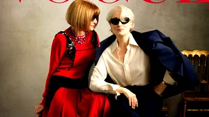 Anna Wintour, de iconische hoofdredactrice van Vogue, staat op de cover van het tijdschrift naast Meryl Streep, de actrice die haar vertolkt in The Devil Wears Prada. De foto is gemaakt door de beroemde fotografe Annie Leibovitz.